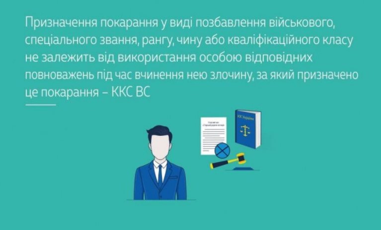 Залишаючи без зміни рішення судів попередніх інстанцій, Верховний Суд вказав, що підставами для призначення покарання у виді позбавлення військового, спеціального звання, рангу, чину або кваліфікаційного класу є: 1) наявність в особи такого звання, рангу, чину чи кваліфікаційного класу; 2) вчинення тяжкого або особливо тяжкого злочину. Кримінальний закон не передбачає необхідності використання повноважень, які має (мала) особа через наявність у неї військового чи спеціального звання, рангу, чину чи кваліфікаційного класу, при вчиненні злочину, за який вона притягується до кримінальної відповідальності.