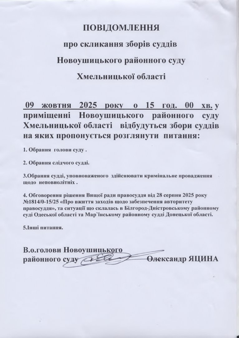 Повідомлення про скликання зборів суддів Новоушицького районного суду Хмельницької області