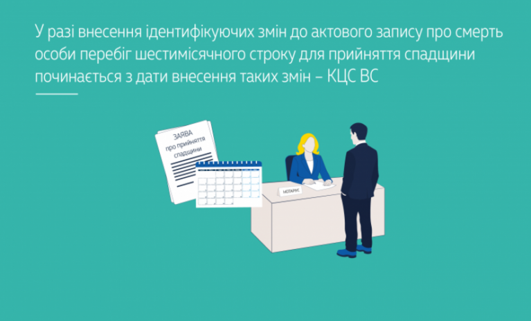 КЦС ВС зазначив, що п. 20 розд. «Прикінцеві та перехідні положення» ЦК України передбачено, що в період дії воєнного стану в Україні та протягом двох років з дня його припинення або скасування у випадку, якщо смерть фізичної особи зареєстрована пізніше ніж через один місяць з дня смерті такої особи або дня, з якого її оголошено померлою, строки, встановлені статтями 1269–1273, 1276–1277, 1283, 1298 ЦК України, обчислюються з дня державної реєстрації смерті особи.