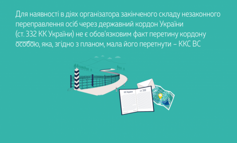 Залишаючи без зміни рішення судів попередніх інстанцій, Верховний Суд вказав, що незаконне переправлення осіб через державний кордон України – це дії особи, які полягають у забезпеченні перетинання (перевезення, переведення) державного кордону України іншими особами. При цьому організація такого незаконного переправлення – це дії особи щодо розробки планів, визначення місця, часу незаконного переправлення, пошуку співучасників, створення організованої групи, її фінансування, озброєння тощо.